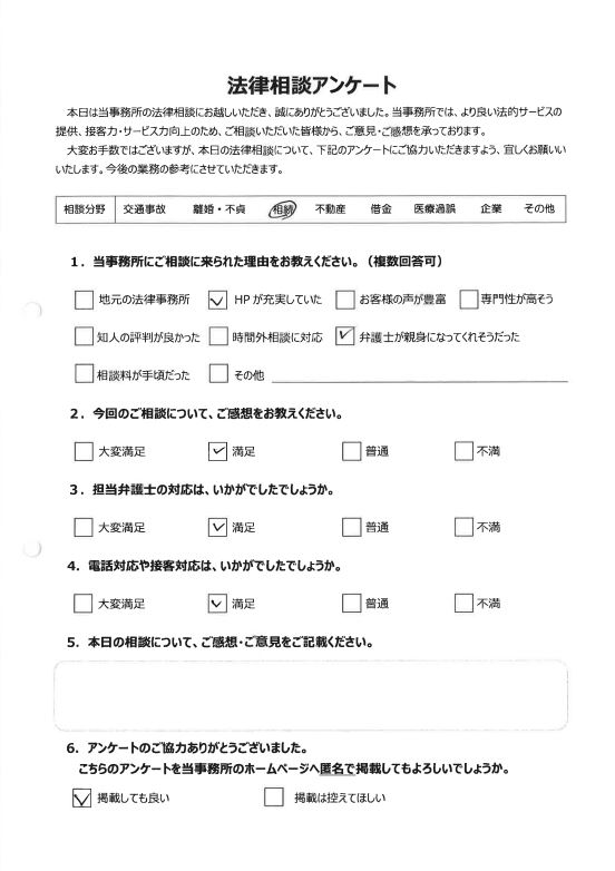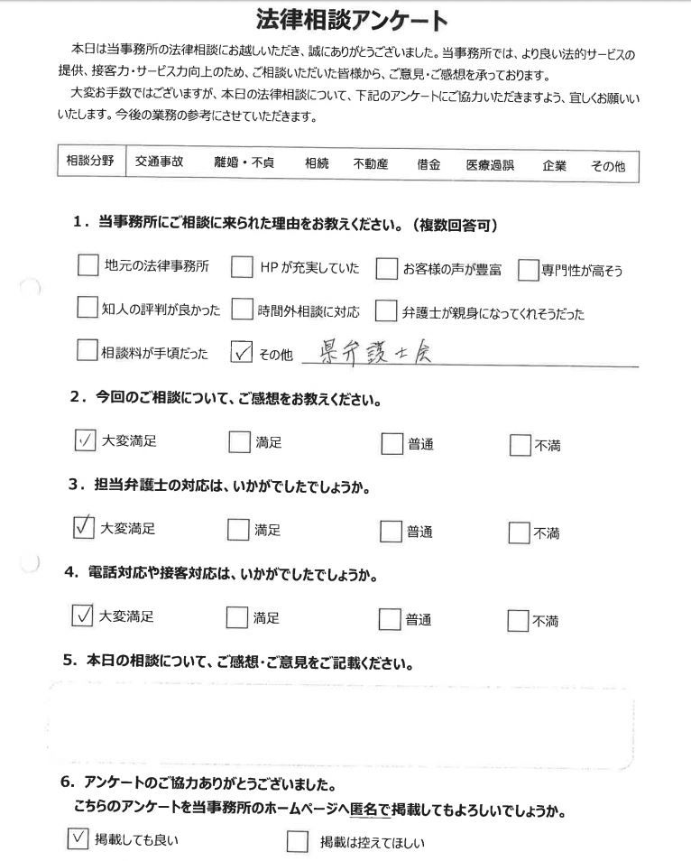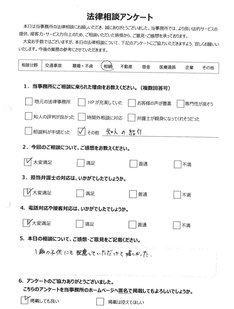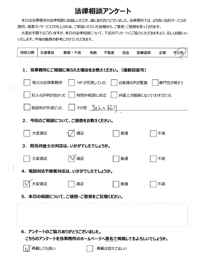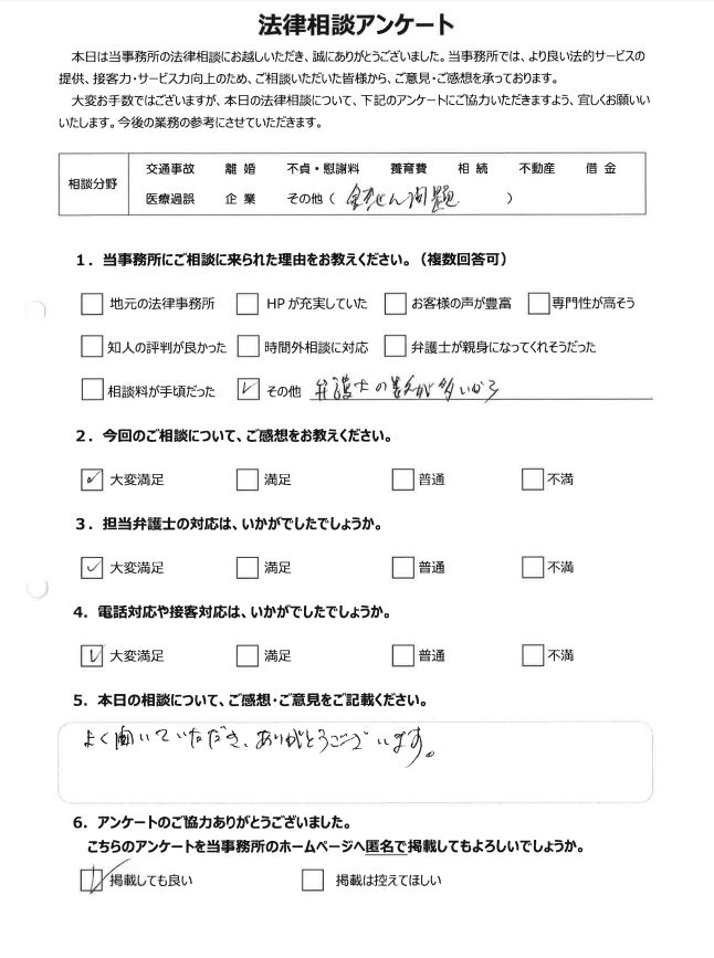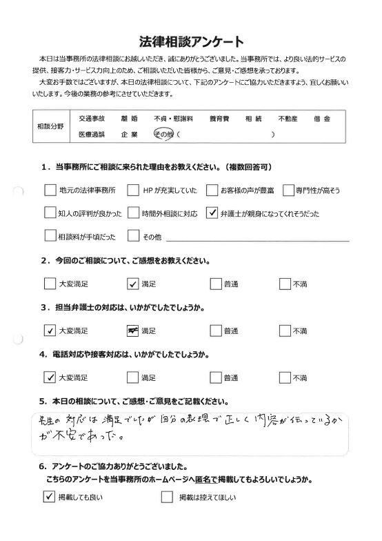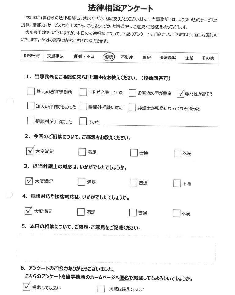 当事務所では高松市の皆さまを中心として、たくさんの方々からご相談をいただいております。ご相談者の皆様さまにご回答いただいたアンケートの一部をこちらでご紹介させていただきます。 是非ご覧くださいませ。 ご来所前のご参考になればと思います。
